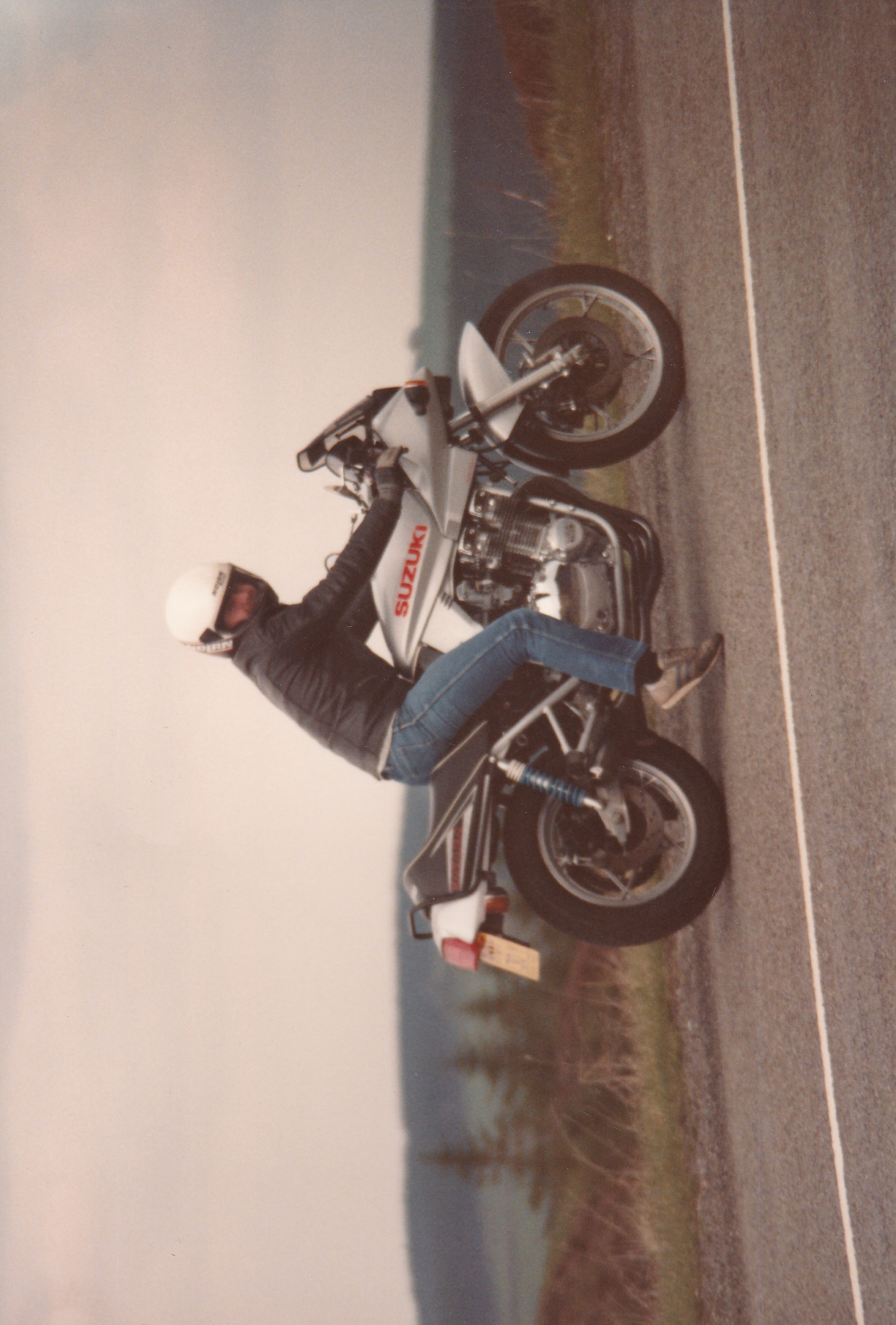 Standard 80's bike gear, Nolan helmet, Kett leather jacket, Lee jeans and random trainers. Not sure why the photo has attached side on, click on it and it's fine.