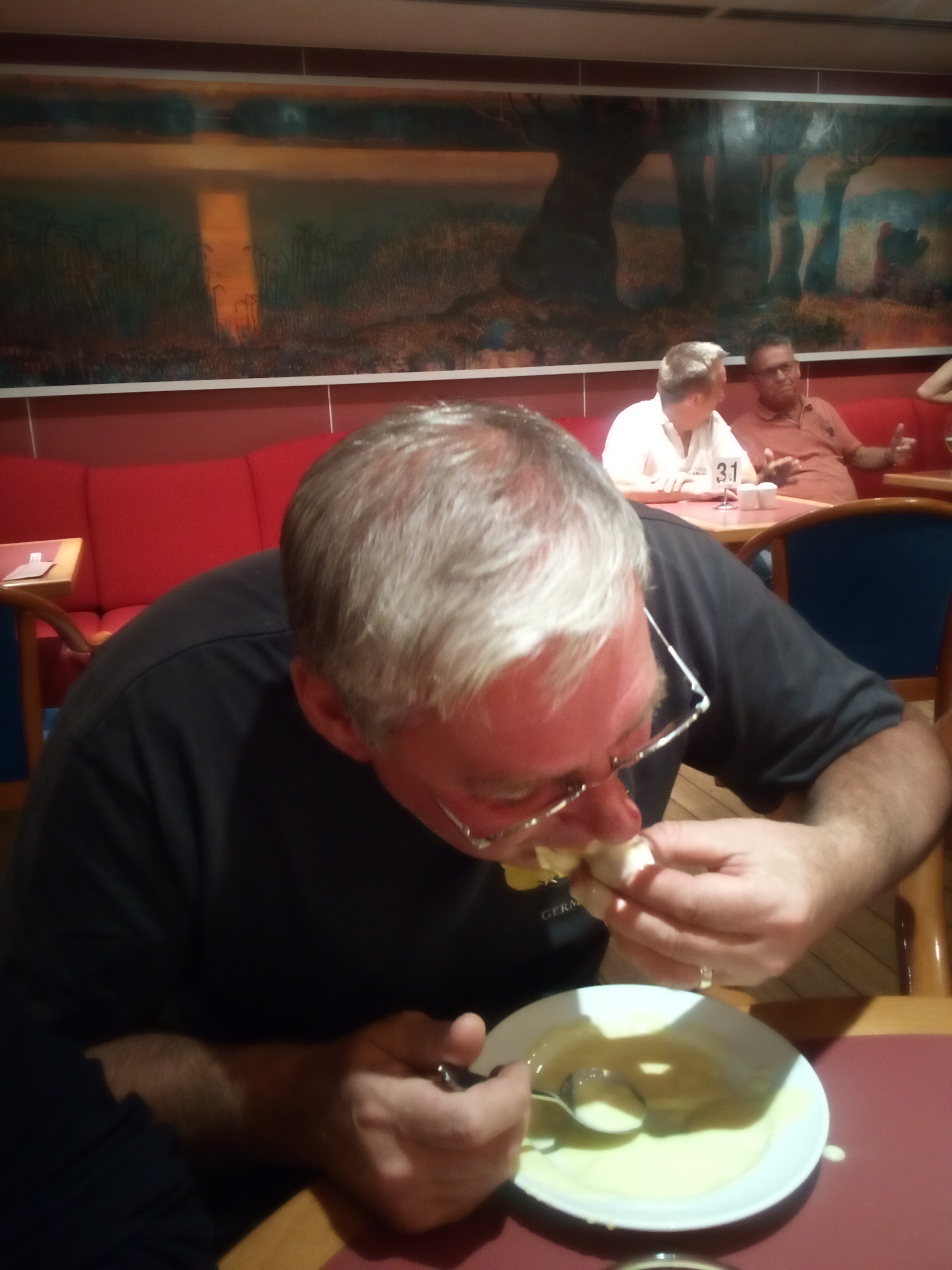 i suppose we should start with fossies culinary masterpiece as we discovered on the ferry over, ladies and gents, i give you the yorkshire pudding full of custard with the profitterole floater... propper finger food as you can see.....