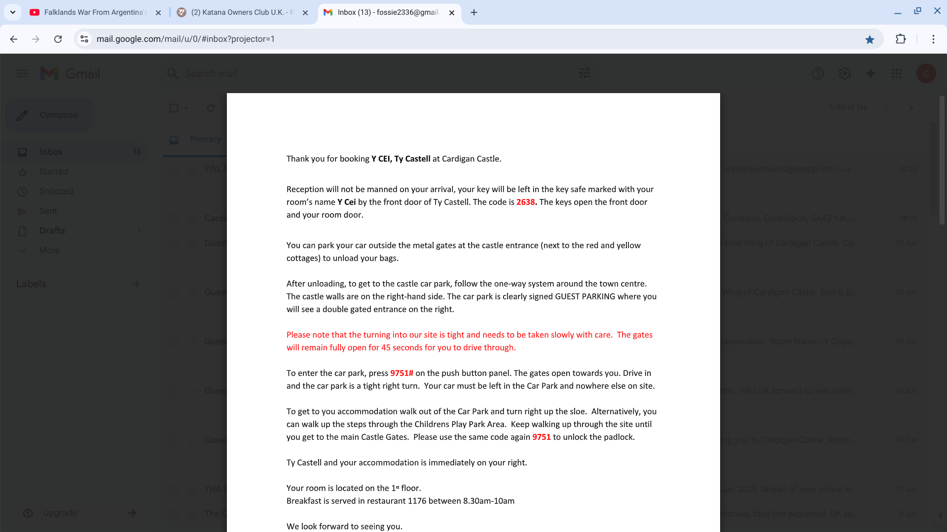I will send a Pm with the codes to the key safes and gates .. Open the keysafe using the number withdraw your room key and replace the keylock.