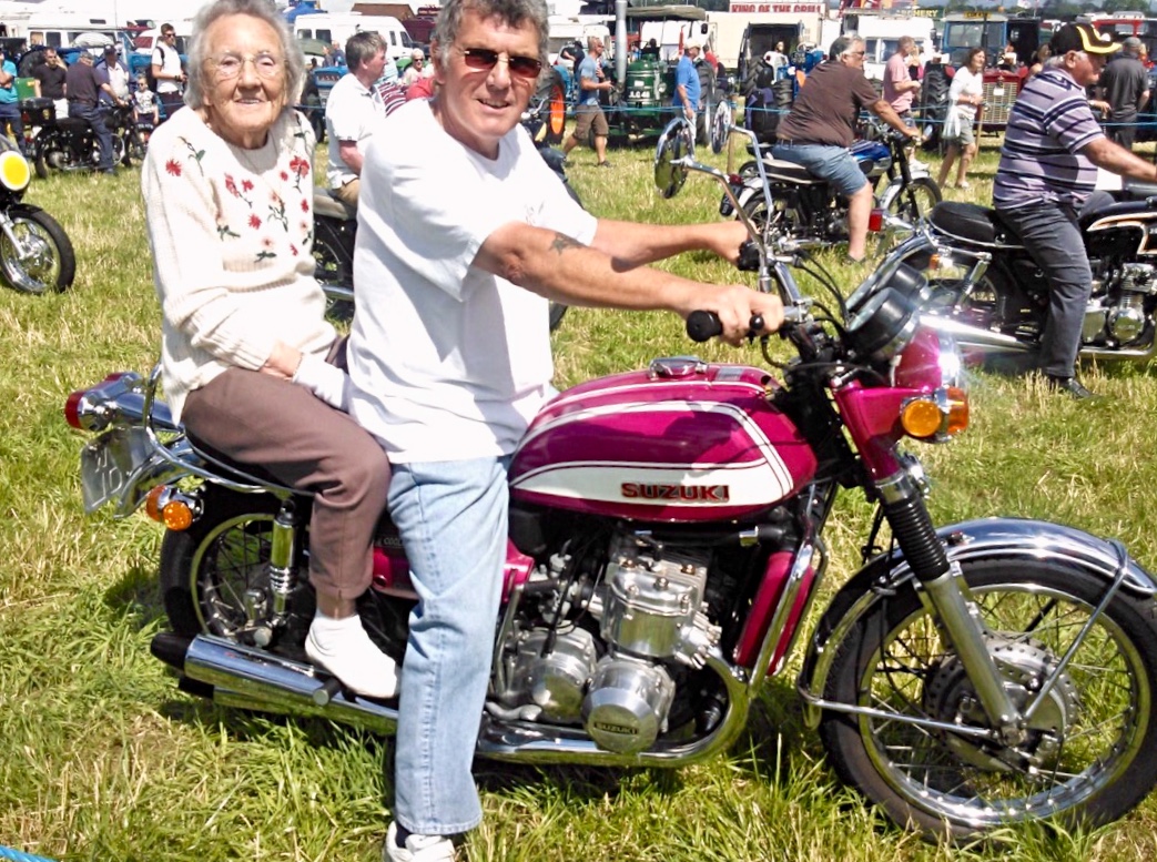My mum then aged 85 and me at a classic bike show 2015 on my GT750J