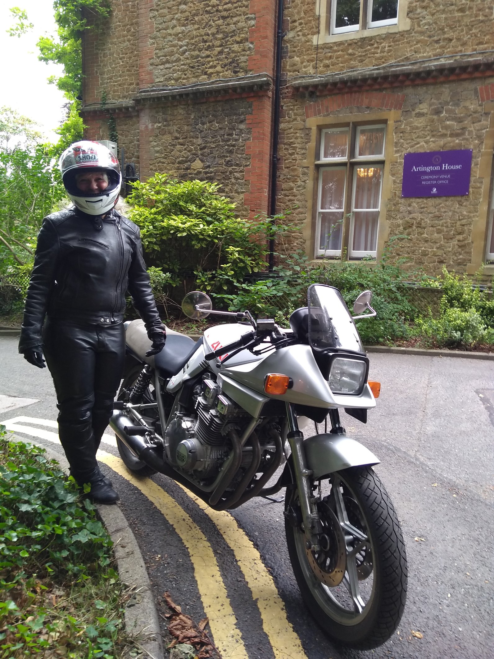 Back at the Register Office 12,544 days later. Still the same wife with smiley cheeks, and still the same bike.