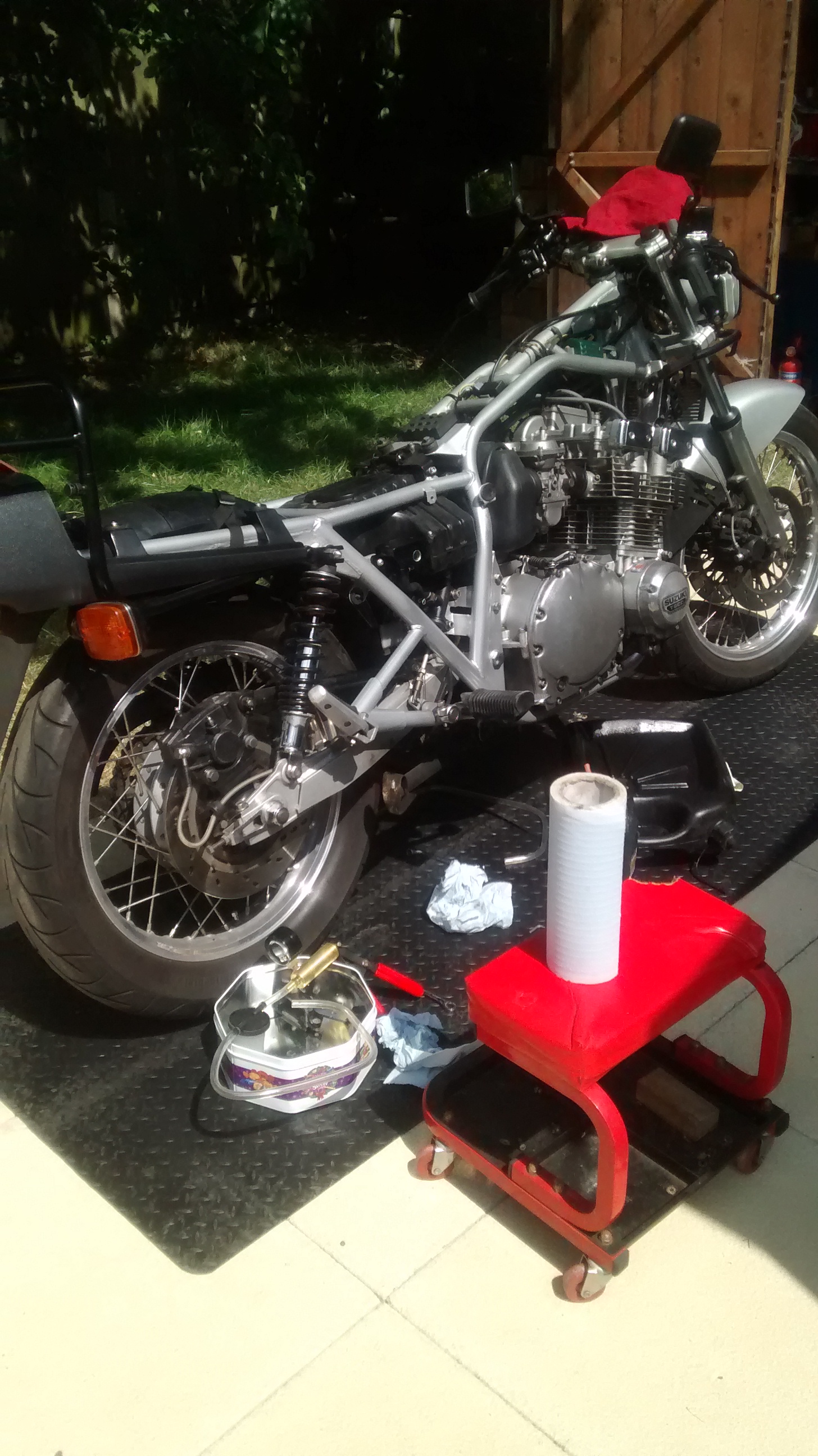 Oil change, brake bleed plus new reservoir on back and pressure switch on front, rack fitted, chain checked and a clean.