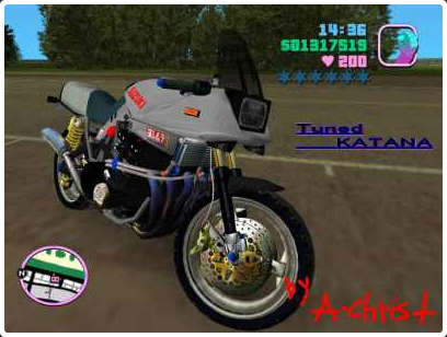 there was at one time a katana download that you could add to the available bikes in the game grand theft auto san andreas (i think though it could have been vice city) for pc. then as well as all the scooters harleys and crossers, you could steal a katana after you have chopped up a drug dealer with your samurai sword.....