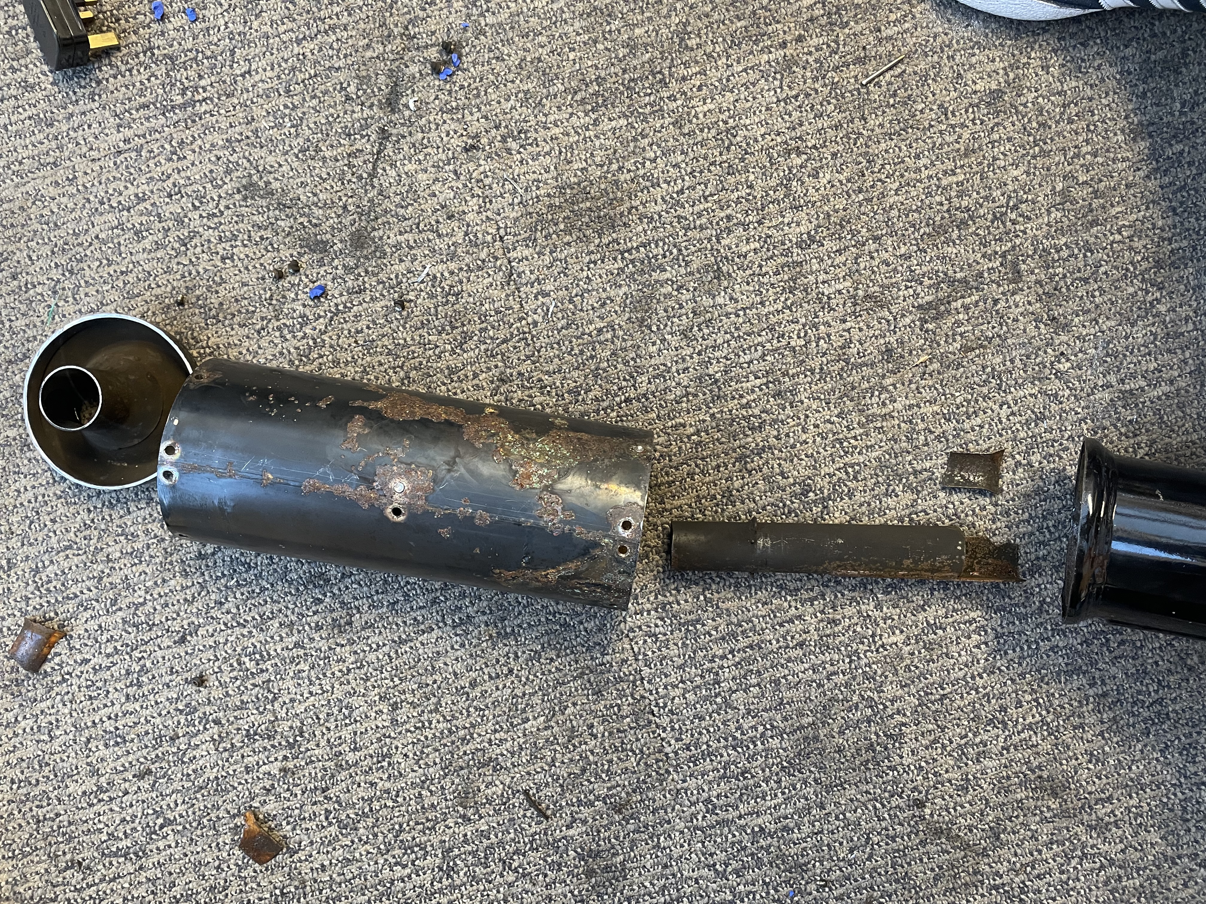 as you look at the Ali cover (whilst on bike) you need to cut the right hand side this will expose the loose baffle. I shall now hand this mess to a mate who hopefully can salvage it. In the mean time searching for decent downpipes or getting some made.