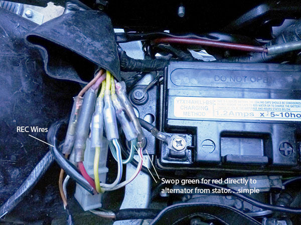 2 photos below in case of confusion, please note only difference to standard all my stator wires are yellow early models should be matching rec wires..tape up whitetracer/green and redtracer/white individually, don't connect them together though, tuck away and forget...sorted, ded easy.