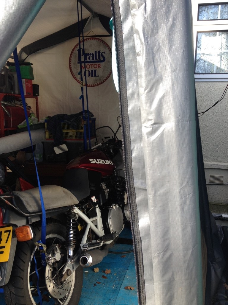 got a bike barn for my, erm, ahem, shed overflow storage problem, its like a big folding siver cross pram cover, or if you like, a convertable car roof, it lifts and folds to open, been up for 18 months now, wind neever bothered it yet.