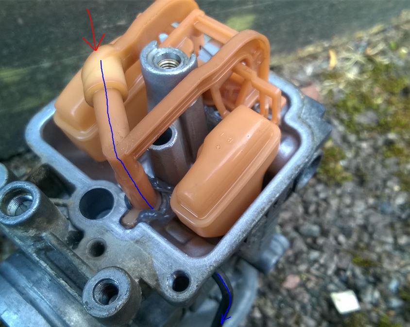 The prime circuit runs through the float and that needs to be checked to be clear right up to the plunger at the top. Bill didn't say if they were. I would take the float out and use brake cleaner (or carb cleaner) sprayed in the each end to make sure it comes out the other end (see image - red arrow is In. While the float is out spray brake cleaner into the carb where the float attaches and check it comes out of the plunger at the top of the carb. I had to do this with the 250 recently, all float orifices were blocked. Also although different design I just did the 1100 that has stood still June 2019 as all of those were blocked as well.