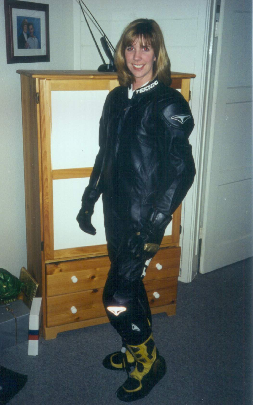 Clare didn't ride, but I put my cheipie leathers on her for some odd reason in 2000 and took this pix.