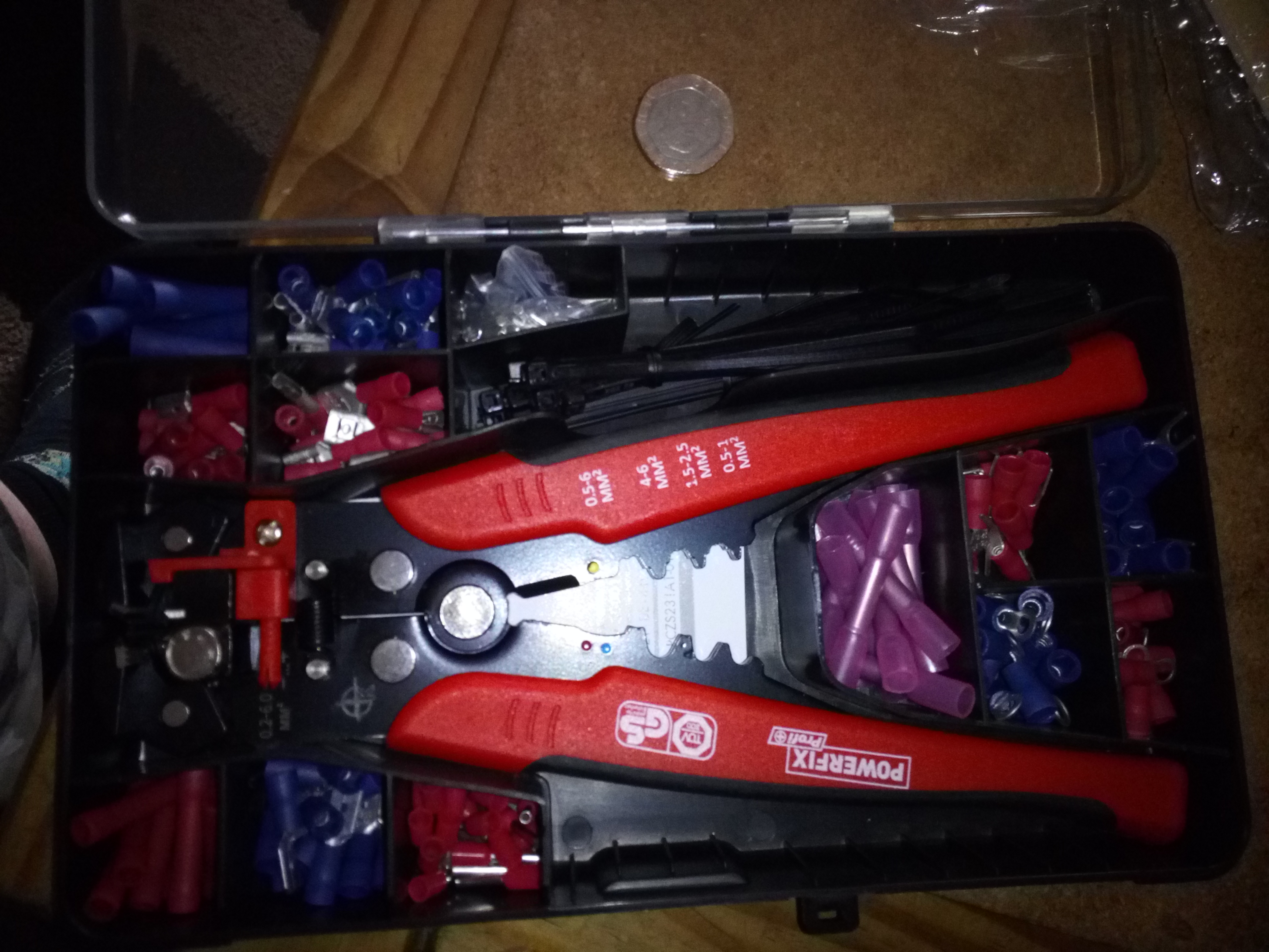 lidl have currently got a potentially useful item in stock considring the number of electrical faults that occur on runs or rallys, its a small plastic box with a set of wir strippers and crimpers and a pretty big selection of crimped connectors, bullets spades, male and female, as well as male and female pins, zip ties etc etc. its only about 8 quid and i reccon well worth at least one person having in their luggage if we go on any long runs in future